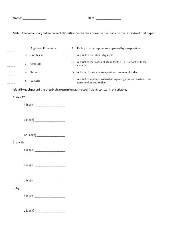 Matching algebraic expressions worksheet. Translating algebraic expressions. The algebra worksheets here focus on translating verbal phrases to algebraic expression featuring exercises with single and multivariable expressions, translating linear equations involving one or two-steps, determining inequalities and much more. Evaluating algebraic expressions. Your students will use this collection of activity sheets to learn how to solve for variables to simplify algebraic expressions. These sets of worksheets introduce your students to the concept of combining like terms, and provide examples, short practice sets, longer sets of questions, and quizzes. This is a paramount skill in algebra, you will ... Chapter 1: The Language of Algebra Introduction In the first chapter of Math Mammoth Grade 7 we review all of the sixth grade algebra topics and also study some basic properties of the operations. The main topics are the order of operations, expressions, and simplifying expressions in several different ways. 1. Find algebraic expressions for the perimeter and area of each rectangle. b) 3 2. Find algebraic expressions for the perimeter and area of these rectangles. x x 3 Find algebraic expressions for the perimeter and area of these shapes. a) 2 3 Worksheet 4y 2x y 6x 5xa x) 3a 4a 4y c) 5x x + y –y e) d) 2a a + 1 f) 2a – b 3a – b 3a 5a 3a 3a a ...