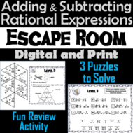 Adding and subtracting rational expressions game escape room math activity