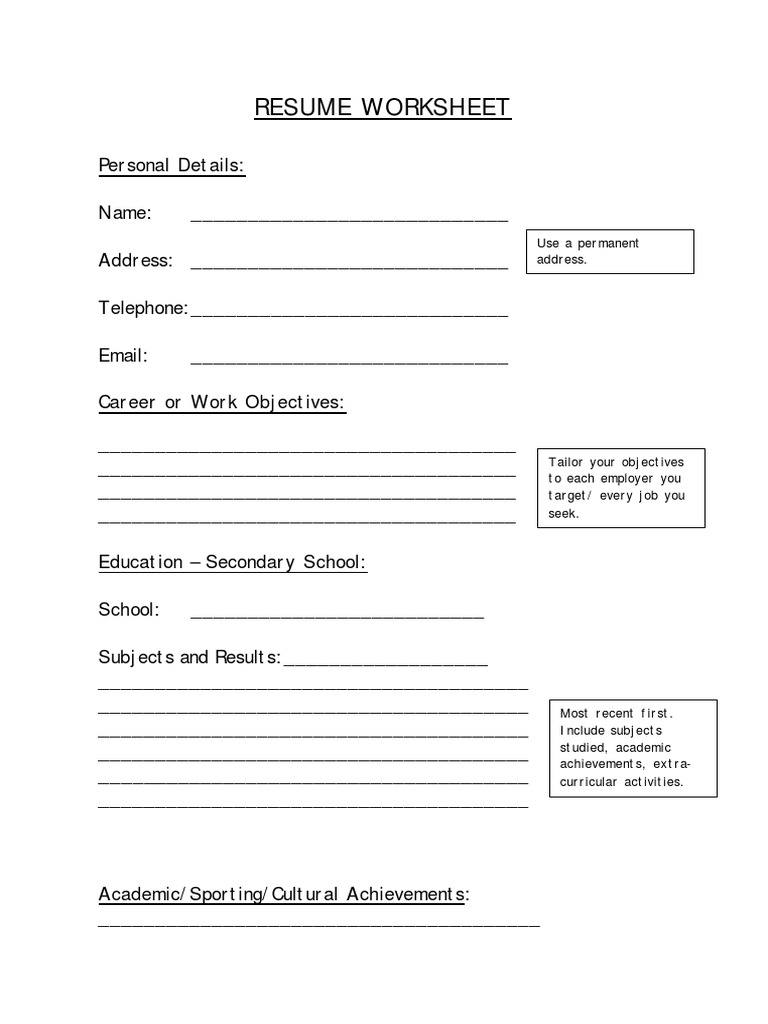 Resume Worksheet For Adults Promotiontablecovers