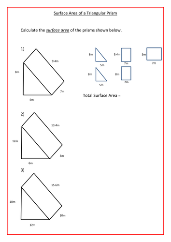 Some of the worksheets for this concept are Surface area of triangular prisms, Surface area of a triangular prism work 7, Surface area of a triangular prism work 7, Surface area of triangular prisms, Measurement work volume and surface area of, Triangular prism surface area work, How to find the surface area of a