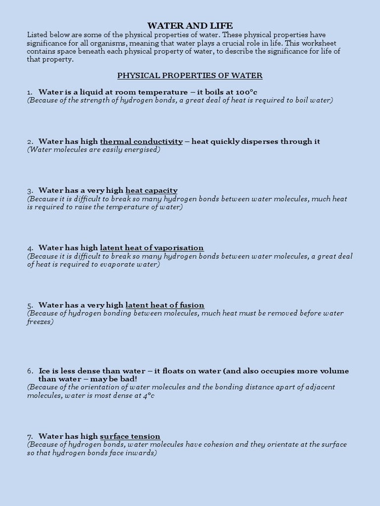 Properties Of Water Worksheet Biology Promotiontablecovers