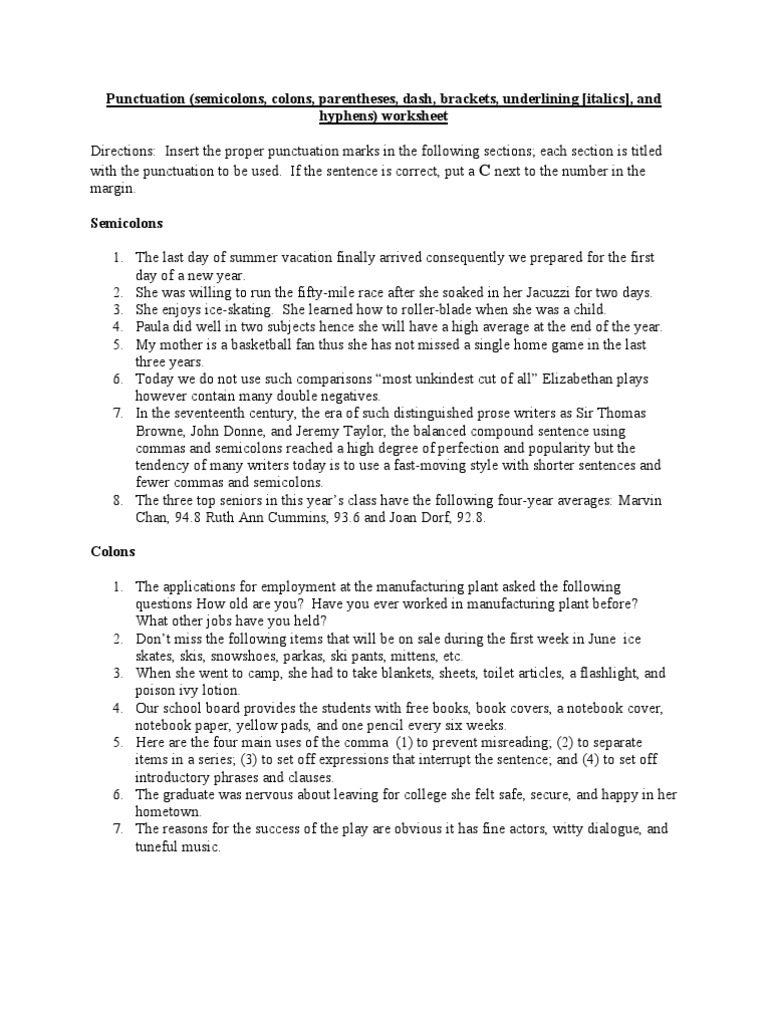 Colons And Semicolons Worksheet Using Semi Colons Colons And Dashes