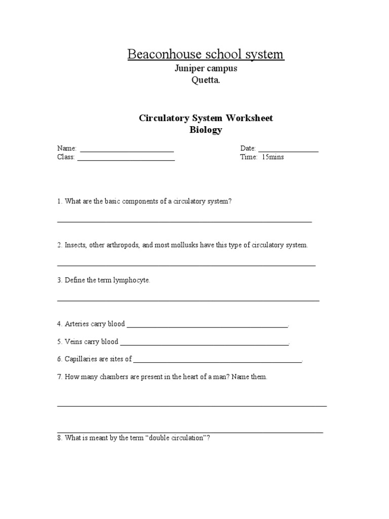 Circulatory system worksheet high school