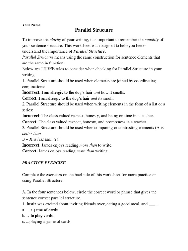 Parallelism Or Parallel Structure Practice Worksheet With Rules Example Ccss