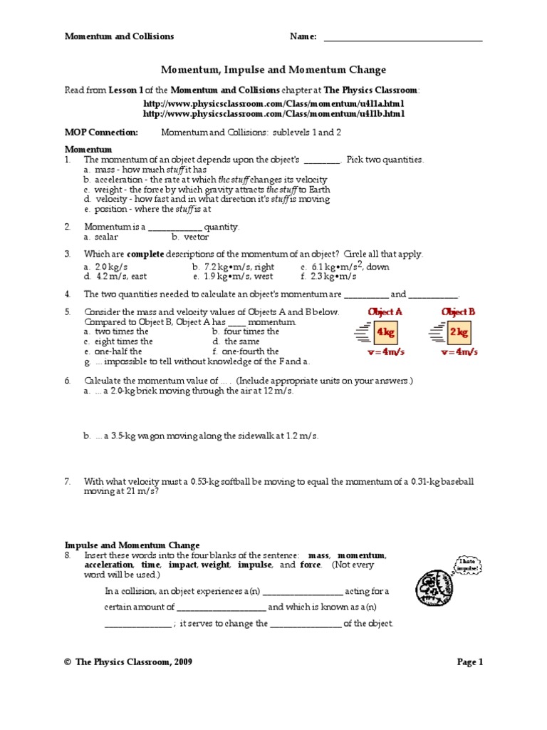 Force And Momentum Problems Worksheet Answer Key Momentum And Impulse Worksheet Key