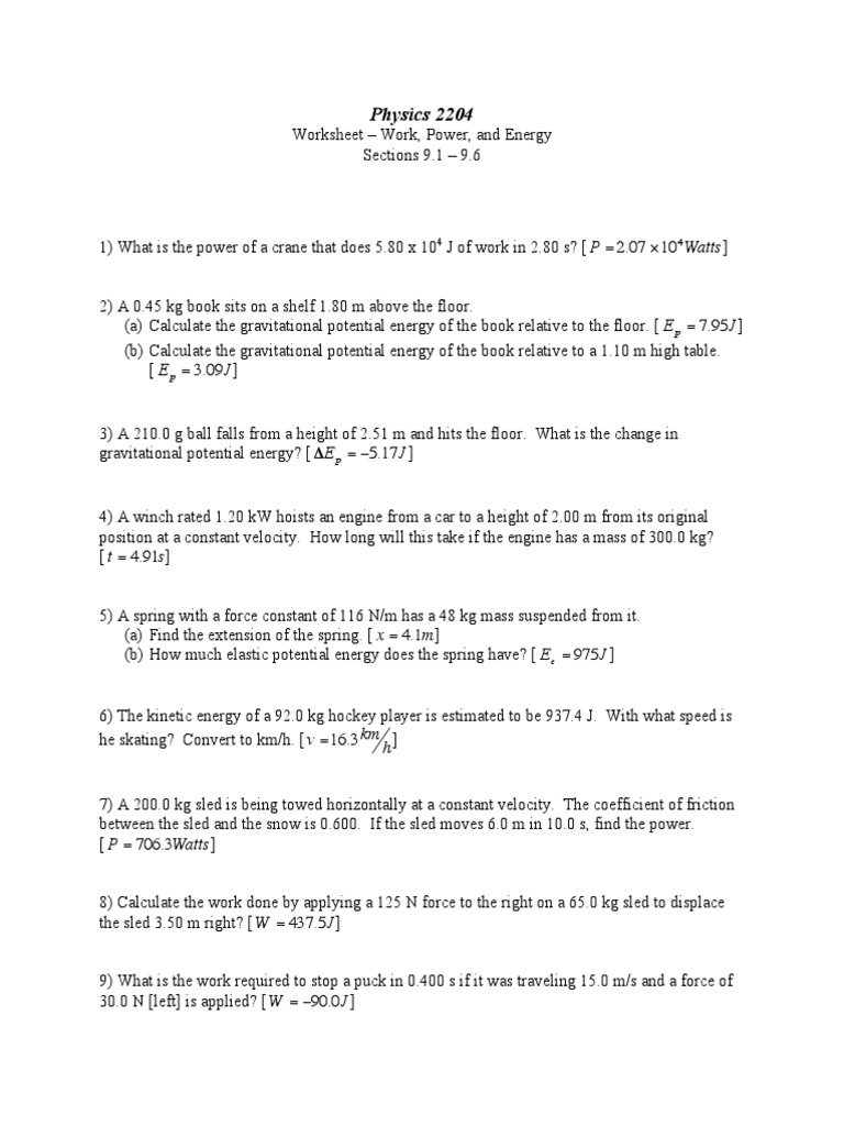 Physics 11 Work Power Energy Worksheet