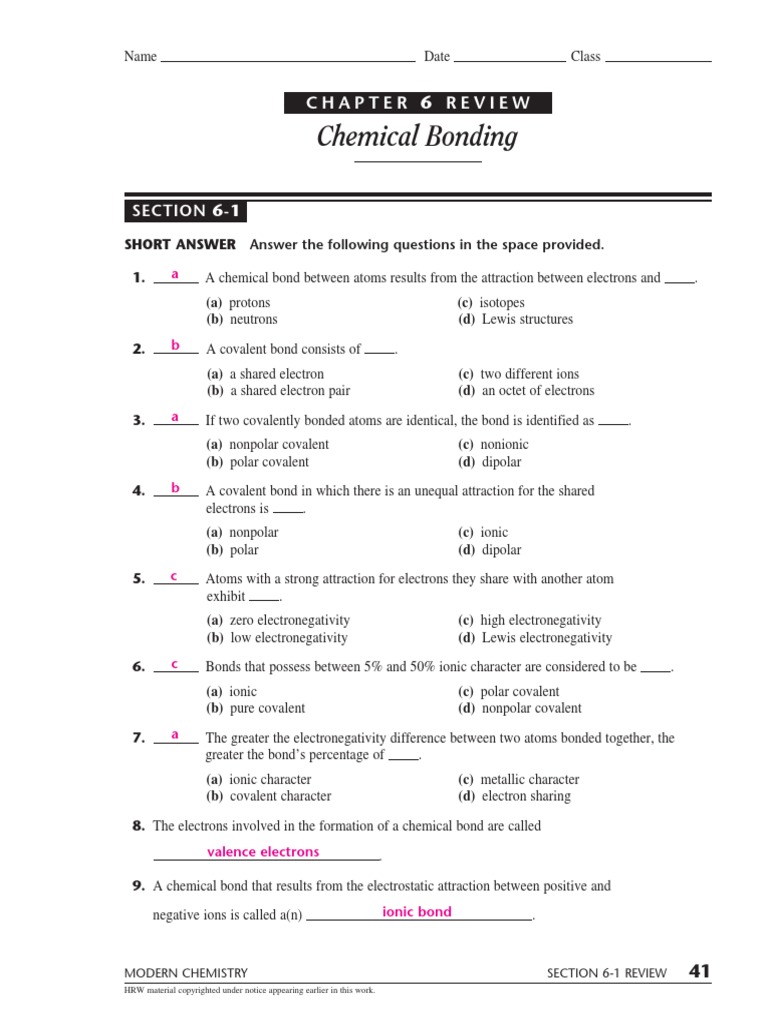 Chemical bond worksheet answers. PROPERTIES CONTROLLED BY CHEMICAL BOND 5 Atomic Structure and Chemical Bonds 9 Name Date Class Chemical Bonds An ion is an atom that is no longer neutral because it has gained or lost electrons Hydrogen bond polar molecule 09/02/2019 · A a chemical bond between atoms results from the attraction between the valence electrons and of different atoms