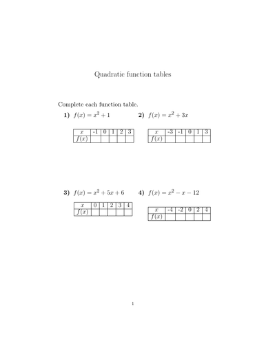 Quadratic Function Tables Worksheet With Solutions