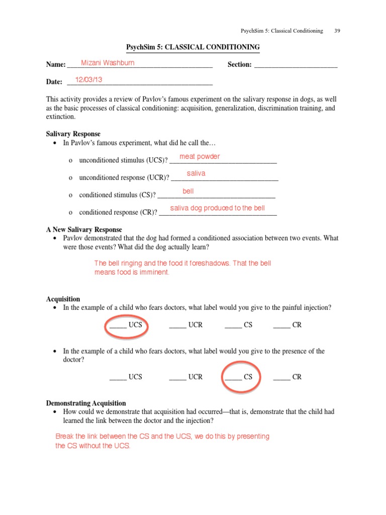 Psychsim 5 Classical Conditioning Worksheet Answers