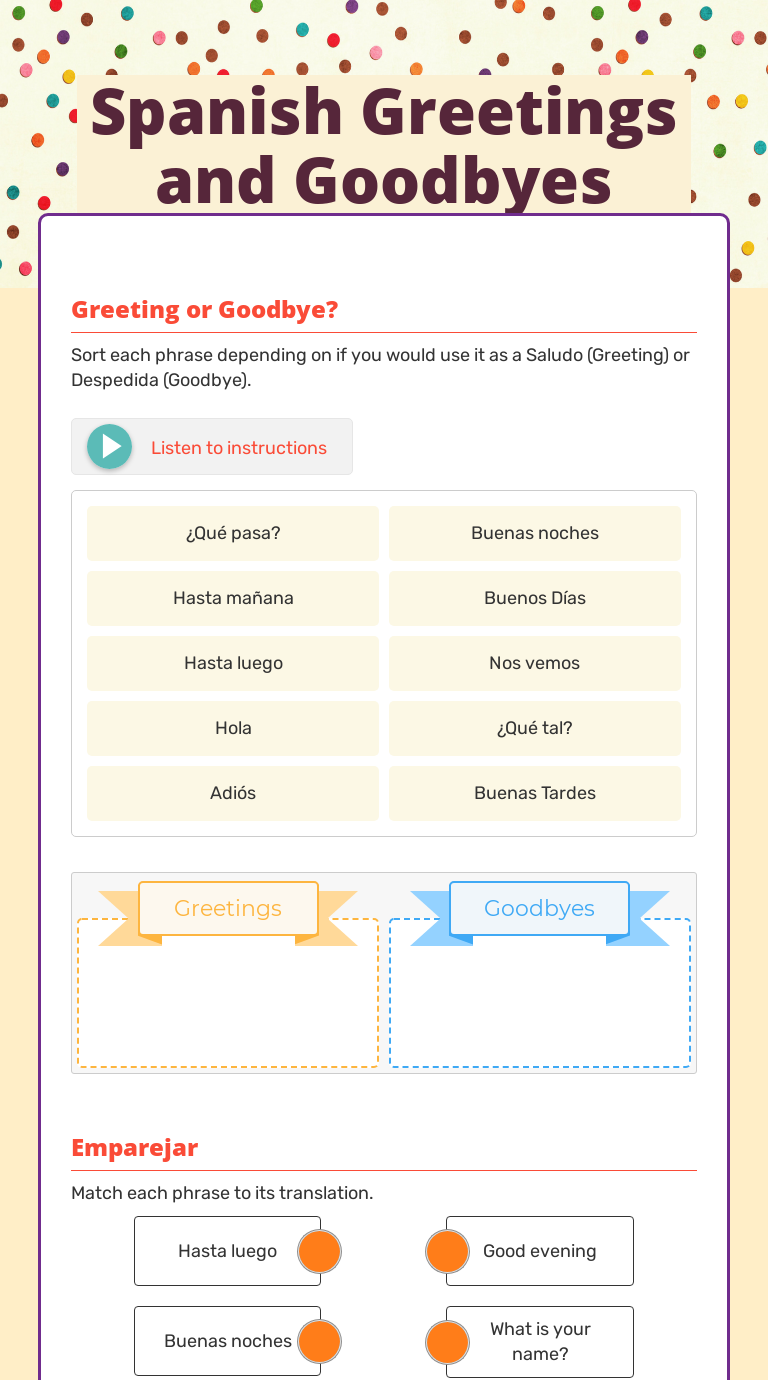 Greetings in spanish worksheet. ID: 713677 Language: English School subject: English as a Second Language (ESL) Grade/level: level 1 Age: 3+ Main content: Greetings Other contents: introduction Add to my workbooks (200) Embed in my website or blog Add to Google Classroom Primary Resources relies completely on contributions from teachers for the resources on the site 30/01/2016 · Objectives: To teach basic greetings & self-introductions in English; This kids English lesson will teach kids to introduce themselves and greet people the first time they meet You will find examples of short dialogues with script using basic phrases and questions, apart from a listening activity on a conversation in Spanish between two friends using greetings, farewells and introductions I believe in a healthy diet of all things good to bring balance to my students