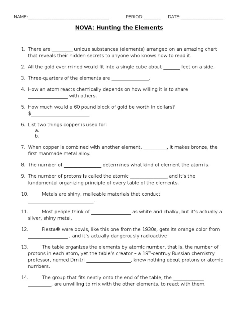 Nova Video Questions Hunting The Elements Worksheet Answers