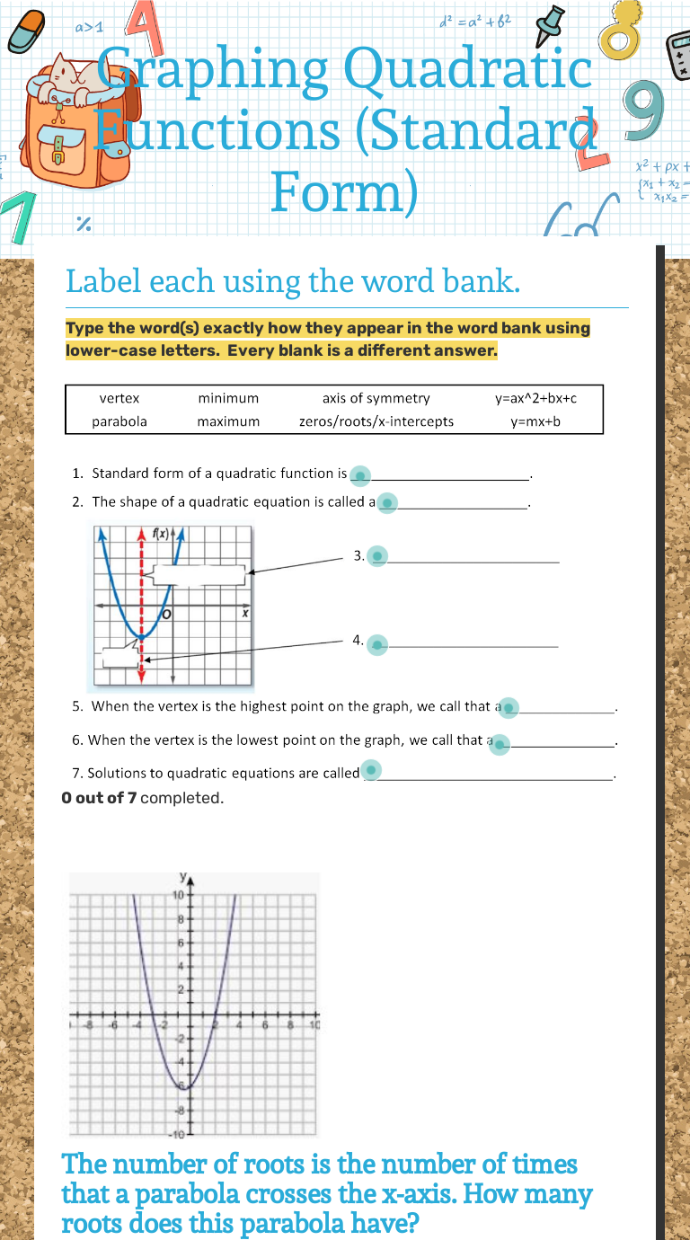 Graphing quadratic functions in standard form worksheet. Graphing Quadratics Review Worksheet Name _____ Fill in each blank using the word bank. 1. Standard form of a quadratic function is y = _____ 2. The shape of a quadratic equation is called a _____ 5. When the vertex is the highest point on the graph, we call that a _____. 6. ©W 42 Y01Z20 2K Guht XaP uS Ho efJtSwbaFrmeI 4L dL 8Cb. w U RApl Olm sr miTgeh KtIs O yrhe 7swelr YvRejdC. 3 0 bMuaXdIei dwIi kt5hX yIon kfPiLn vi3t Ae7 5A ylng 9eBb VrjaC i1 D.K Worksheet by Kuta Software LLC Kuta Software - Infinite Algebra 1 Name_____ Graphing Quadratic Functions Date_____ Period____ Worksheet Graphing Quadratics from Standard Form Find the vertex, axis of symmetry, x-intercepts, y-intercept, value of the. Find two quadratic functions, one that opens upward and one that opens... 16. 17. 18. Write the equation of the quadratic in standard form from the graph below 19. _____ 20. _____ Author: Justin Created Date ... Practice Worksheet: Graphing Quadratic Functions in Standard Form 1] For any quadratic of the form , the axis of symmetry is always the line _____. 2] If the axis of symmetry of a quadratic is and is on the graph, then the point (____, ____) must also be on the graph. 3] For any quadratic of the form , the y-intercept is always the same point.