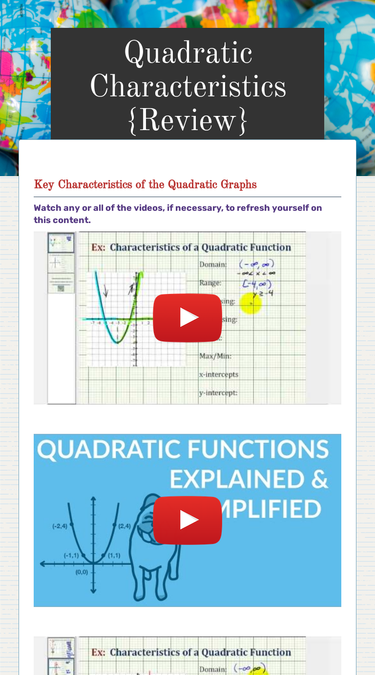 6. I can graph quadratic functions in vertex form (using basic transformations). 7. I can identify key characteristics of quadratic functions including axis of symmetry, vertex, min/max, y-intercept, x-intercepts, domain and range. Writing Equations of Quadratic Functions 8. I can rewrite quadratic equations from standard to vertex and vice.