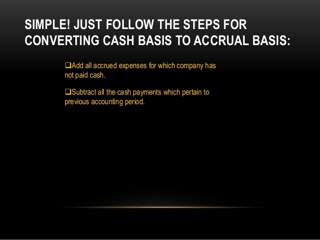 Accrual to cash basis conversion 1. Accrual to Cash Basis Conversion Simplified in mere six steps! 2. The Accrual to Cash Basis Conversion has been a tricky one for accounting students of all ages. The accrual basis of accounting is records revenue and expenses in the period in which they are earned or incurred irrespective of the cash flow. Cash basis recognizes revenue only when cash is.
