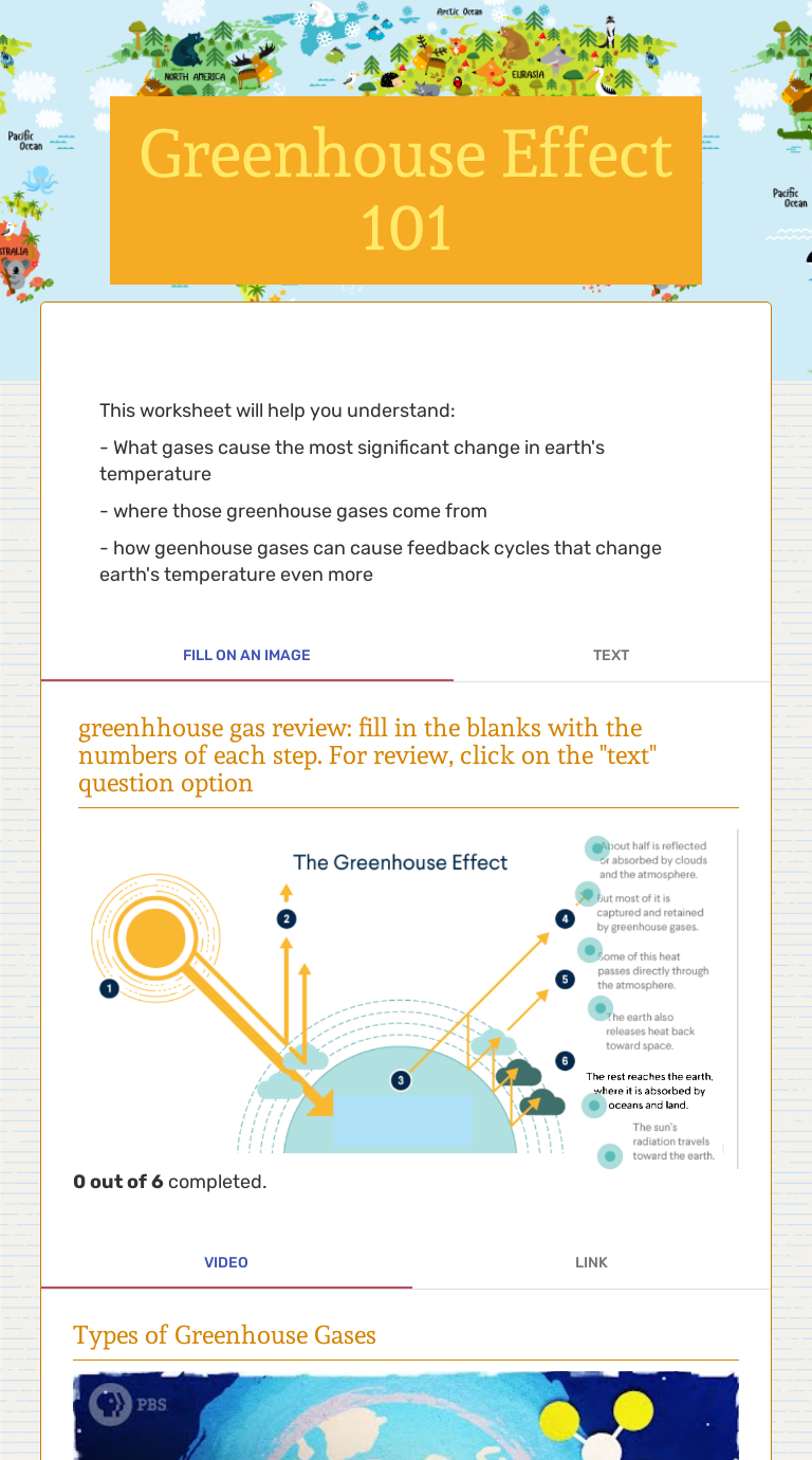 Below are the answers to the reading lesson based on matching headings about The Greenhouse Effect. If you have not completed this reading lesson, please do it before look at the answers. Click here: Matching Headings Reading Practice. Below you will find the headings options and the answers. Matching Headings Options. i Temperatures on Earth; ii. Greenhouse Effect Guided Worksheet. Greenhouse Effect Online Lab.docx - 22 kB. Download all files as a compressed.zip. Title. Greenhouse Effect Guided Worksheet. Description. Worksheet guides students on how to complete simulation in a simple and straightforward manner. Subject. Earth Science. greenhouse effect to put them in their proper order starting at the sun. (6 points) __j__When solar energy waves hit the earth's surface, they slow down and form longer heat (thermal) energy waves. ___2__ some solar energy waves reflect off of clouds and greenhouse gasses and return to space.