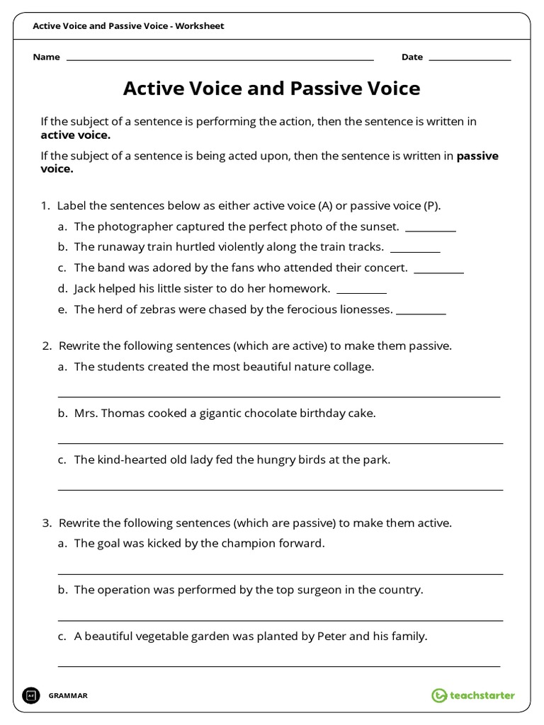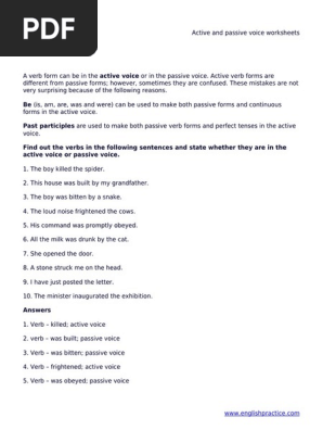 I know that with few exceptions, passive voice sentences can be recast in the active voice with the agent moved to the subject position with no essential change of meaning. Can you please show such exceptions where passive CAN'T be recast as active? Can't think of this. Thanks a lot I know that with. Active Voice Vs Passive Voice Worksheet Library Getting the books active voice vs passive voice worksheet library now is not type of inspiring means. You could not on your own going taking into account books buildup or library or borrowing from your friends to right of entry them. This is an utterly easy means to specifically get lead by on.