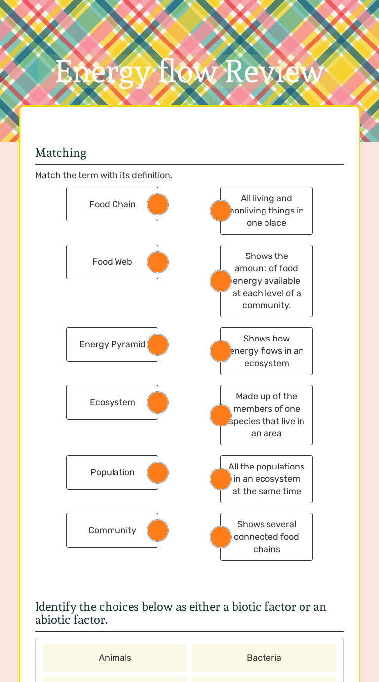 Ecosystems unit activity 3 3 tracing carbon through ecosystems ppt from 3.3 energy flow in ecosystems worksheet answers , source:slideplayer . Food chains and food webs energy flows through an ecosystem in one direction from primary producers to various consumers. 3 2 energy flow answer key pdf honestly we have been noticed that 20 science. Both species are relatively recent. 2 match the words to the definitions. On this page you can read or download flow of matter and energy in ecosystems worksheet answers in pdf format. They are in pdf form you can use them for google classroom or any other online. U n it a ecosystems 2 nel ecosystems ecosystems support life. 9. What percentage of the caterpillars' original energy is available to the hawk? D.LP ·/. I 0. What percentage of the oak leaves' original energy is available to che hawk? ~ 1\1 Q.1·1. ~ 11. Explain why an energy pyramid in any ecosystem typically is limited co four or five levels only. S I Vl C.e 6V1 I 1.f'I O. /. j.-e f S {)61 s;~o{ cfVl. 2. Lesson 2- Energy Flow Through an Ecosystem 7 3. Lesson 3- Food Chains and Webs 12 4. Worksheet- Food Chain 15 5. Worksheet- Food Web 16 6. Worksheet- Food Chain QUIZ 1 & 2 17 7. Worksheet- Match the food chain 19 8. Worksheet- Trophic Levels 20 9.