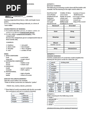 PDF. This worksheet teaches students about the Anglo-Saxon language and how kenning's were used during this time to refer to an object or person. Its a fun engaging.