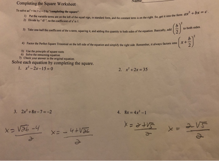 Worksheet. 1. What would the first step be in completing the square of the following equation? Factor 2 out of each term in the trinomial. Add 7 to both sides of the equation. Add 55 to both sides. Completing the Square Worksheet: This activity allows student to practice solving 12 quadratic equations by completing the square. Most problems a = 1 but there are some in which a is not 1. The students then use their answers to solve the math fun fact! *Answer key included* For more Algebra Act. Worksheet of completing the square questions. Creative Commons "Sharealike" Reviews. 4. Something went wrong, please try again later. xhunter9876. 2 years ago. report. 4. Real good. Empty reply does not make any sense for the end user. Submit reply Cancel. scheung3. 2 years ago. report. 4. This is good, but an answer sheet would have been. Completing the square worksheet 2 asks questions on expressing quadratic equations in the correct completing the square form. Since a 1 this can be done in 4 easy steps. Instructions use black ink or ball point pen. By completing the square solve the following quadratic x 2 6x 3 1 step 1.