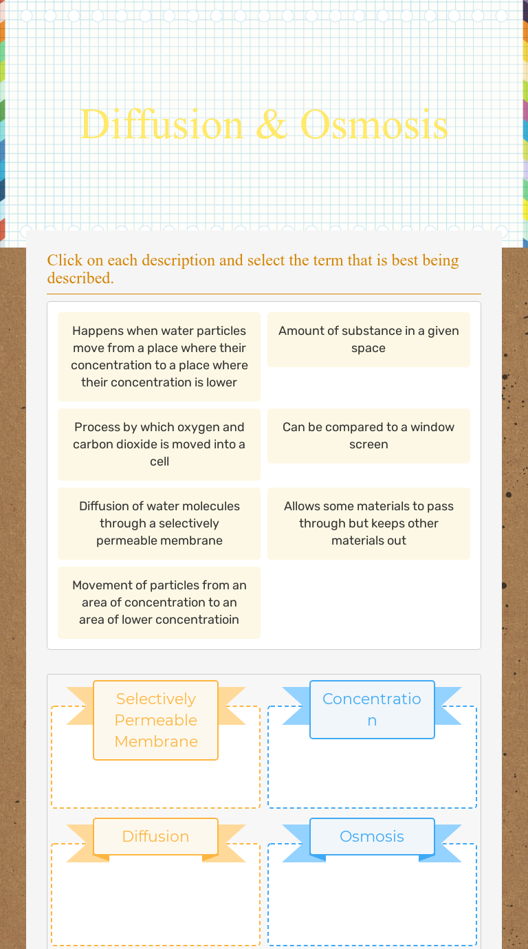 Dec 13, 2019 - Diffusion and Osmosis Worksheet Answer Key - Despite a superior template you might not have a good handle on where to begin. When you locate a template. Pinterest. Today. Explore. When the auto-complete results are available, use the up and down arrows to review and Enter to select. Touch device users can explore by touch or with. Diffusion and Osmosis Worksheet 1. How are the molecules moving in the examples below? Write OSMOSIS or DIFFUSION. a. The student sitting next to you just came from gym class and forgot to shower and you can tell. b. After sitting in the bathtub for hours, your fingers start to look like prunes. c. The girl sitting two rows ahead of you put on. Diffusion and osmosis worksheet answer key osmosis. If you can t refer to the vocabulary sheet and practice until you can. How are the molecules moving in the examples below. What does the term semi permeable or selectively permeable mean. Higher temperatures tend to raise the rate of diffusion. Write osmosis or diffusion. Diffusion and osmosis answer key. Diffusion and osmosis worksheet answer key and worksheets 48 awesome diffusion and osmosis worksheet answers full. Diffusion and osmosis answer key displaying top 8 worksheets found for this concept. True and false and short answer add to my workbooks 4 download file pdf add to google classroom share through.