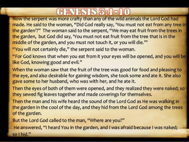 Answer: The subtle difference of the Hebrew meaning "naked" before the Fall and the selected use of the word "naked/ erom" after the Fall in Genesis 3:7-11 and in Deuteronomy 28:48 is not so subtle message to the people of the Sinai Covenant to whom this sacred text was first given. The message is that to be "naked" through the introduction of. Answer. The fall of man occurred sometime after God created the world and after Satan's rebellion in heaven. We find the biblical account of creation and the fall of man in Genesis 1-3. According to the book of Genesis, God spoke everything into existence: sky, planets, seas, vegetation, animals, and everything else.. Start studying Chapter 3 of Genesis, "The fall of man". Learn vocabulary, terms, and more with flashcards, games, and other study tools. Lesson 28: Genesis 3:1-7a The Fall of Man Lesson 29: Genesis 3:4-7 Human Good and Morality Lesson 30: Genesis 3:6-7 How the Spiritual Impacts a Nation Lesson 31: Genesis 3:6-11 God Comes into the Garden after the Fall of Man Lesson 32: Genesis 3:8-11 God Speaks to Adam after the Fall Lesson 33: Genesis 3 The Truth of the Bible