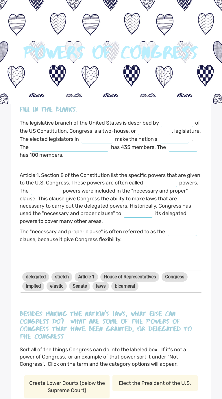 House senate congress worksheet. Some Good Reasons For Doing All Your Paper Worksheets Rewind; Strategies for Writing Your Own Research Paper; Take an Essay Writing Course and Enhance Your Skills; Term Paper Writers; The Complexity of Essays I am worried about our tendency to over invest in things and under invest in people. ~John Kenneth Galbraith When I was a kid, things felt different. They were different. It was a long time ago. I painted my nails Electric Yellow, drank Tab, and wore my favorite blue jelly shoes everywhere. And I remember… “Representatives and direct Taxes shall be apportioned among the several States which may be included within this Union, according to their respective Numbers, which shall be determined by adding to the whole Number of free Persons, including those bound to Service for a Term of Years, and excluding Indians not taxed, three fifths of all other Persons. The actual Enumeration shall be made. make treaties with the approval of the Senate. veto bills and sign bills. represent our nation in talks with foreign countries. enforce the laws that Congress passes. act as Commander-in-Chief during a war. call out troops to protect our nation against an attack. make suggestions about things that should be new laws. lead his political party.