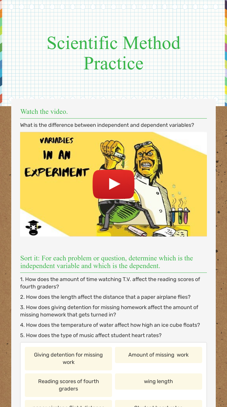 The scientific method is a process that can help you in all walks of life, not just in a science lab Scientific method practice worksheet answer key. The basic overview of the method requires you first The series of worksheets you will find in this section will really test your understanding of this concept. You will be put to the test in many diverse scenarios Scientific method practice.