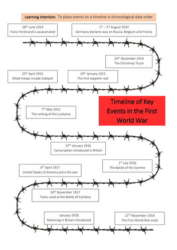 World war 1 timeline worksheet. docx, 262.32 KB. docx, 25.88 KB. jpg, 2.6 MB. A chronological activity for students in which they have to place a selection of significant historical events accurately on a timeline of the First World War. There is a teacher-produced model and a model produced by a student. Creative Commons "Sharealike". World War One A4 Display Timeline. World War 1: KS2 Facts and Information PowerPoint. KS2 First World War British Soldier Labelling Activity. First World War Timeline Fact Sheet. World War One - World War One Trench Labelling Worksheet. FREE Resource! First World War eBook. About This Quiz & Worksheet. World War I was a complex and multifaceted event that involved a fairly complicated timeline. This quiz and worksheet is a great way to go over major events of the war. Showing top 8 worksheets in the category - Timeline Of World War One. Some of the worksheets displayed are World war i timeline c, World war 1 timeline, The main events of the first world war student a work, World war 1 c, Timeline of the second world war, Second world war, World war ii unit powerpoint, 5 wwii lesson planscompared1.