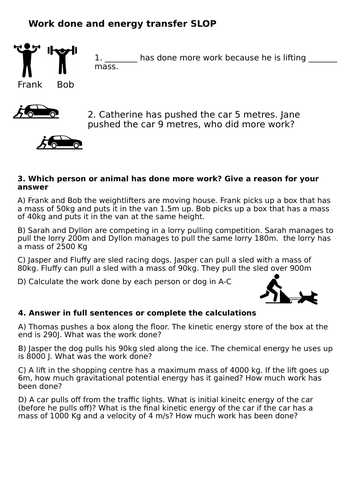 Created Date: 5/2/2017 4:55:44 PM Work and Power. 1. Calculate the work done by a 47 N force pushing a pencil 0.26 m. 2. Calculate the work done by a 47 N force pushing a 0.025 kg pencil 0.25 m against a force of 23 N. 3. Calculate the work done by a 2.4 N force pushing a 400. g sandwich across a table 0.75 m wide. 4. 54. $3.00. PDF. Calculating Work and Power Handouts/ ActivityYou will receive: Information sheet with work and power equation triangles/ and units.Fill in the blank section and substitution for formulas.Work and Power Equation Sheet that includes word problemsSix Work and Power problem cards. The cards should be p. calculate work done. calculate work done by multiple forces. define power and its equation. calculate power. explain how force, energy and work are related. calculate electrical power and cost of using electricity. define energy and list different types of energy. name and describe different forms of energy.