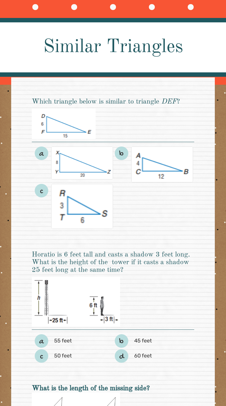 More Similar triangles interactive worksheets. Worksheet 4.3 Similar triangles. by amycaballero_2020. Worksheet 4.4 similar triangles. by amycaballero_2020. Worksheet 4.2 Solving Similar Triangles. by amycaballero_2020. Unit 4 Test Similar Triangles M3-6. by amycaballero_2020.