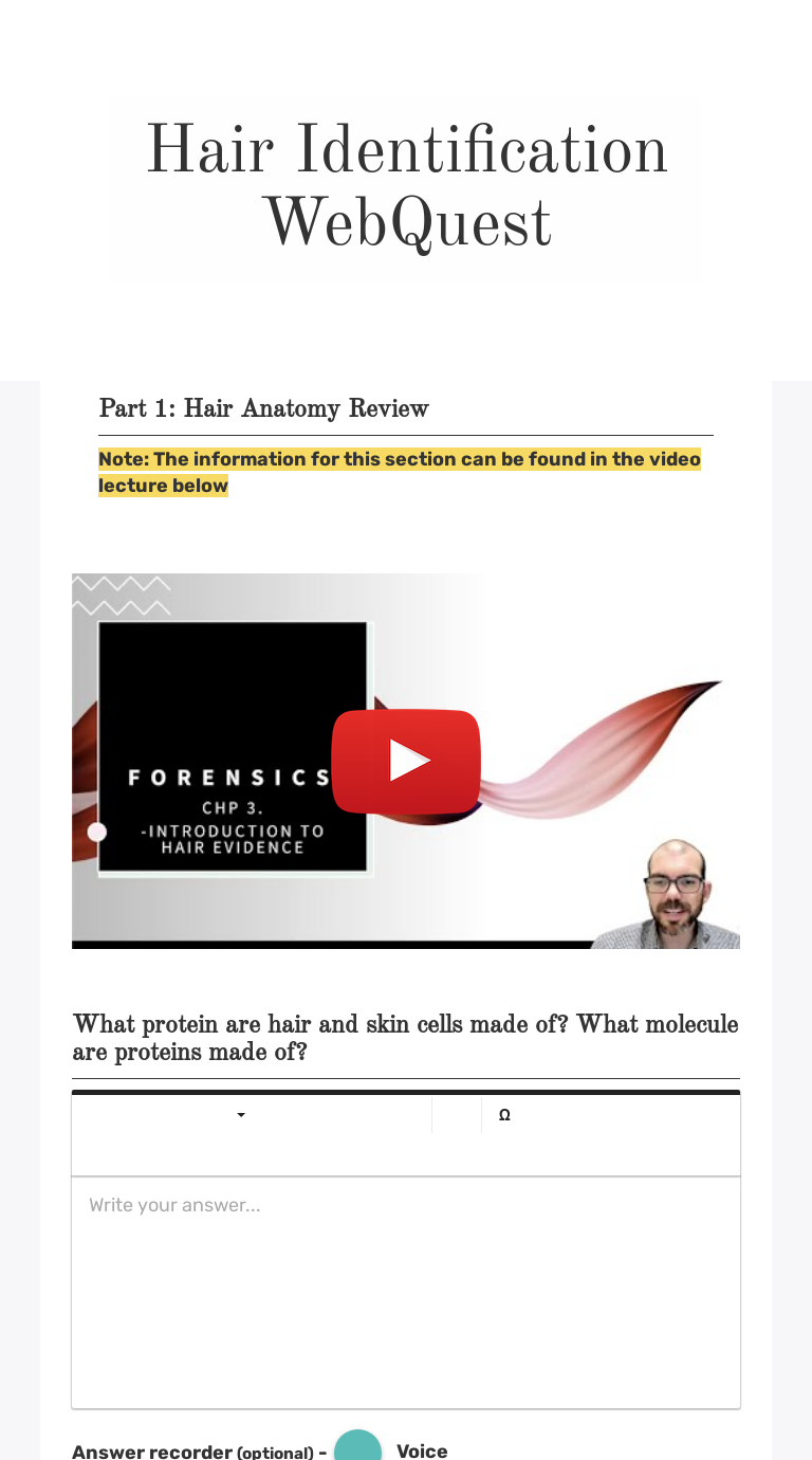 Hair and fiber evidence worksheet answers. The Forensics: Hair and Fiber Evidence Packet includes a PowerPoint with embedded video clip links, illustrated Student Guided Notes, Teacher Notes, Worksheet with Answers, and a Hair Activity. The PowerPoint is fully editable. The Notes & Worksheets are editable Word Docs too. This will allow y The Fiber Evidence Review Worksheet contains a Crossword Puzzle with 35 questions, 9 fiber classification questions, 9 fill-in questions, and 3 diagram label questions. It includes a 2-page student worksheet and a 2-page teacher answer key and comes as both PDF and editable.docx files.The Fiber Evi Unit 1 - Crime Scene and Evidence. Unit 2 - Hair and Fibers. Unit 2.5 - Handwriting and Document Analysis. Unit 3 - Criminal Law Background and Fingerprinting. Unit 4 - Tool Marks, Casts, and Impressions. Unit 5 - Death: Meaning, Manner, Mechanism, Cause and Time. Unit 6 - DNA. 11. Directions: Your team will need to use a microscope to document all the hairs and fibers in your set. Write the name of the hair or fiber on the line and then draw what you see under medium or high power. Be sure to indicate the power of magnification! Add a description that highlights the unique characteristics of each hair and fiber sample.