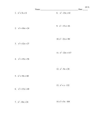 Algebra worksheets factoring trinomials. Solving quadratic equations by factoring completing the square. Algebra 1 Worksheets Quadratic Functions Worksheets Quadratics Completing The Square Solving Quadratic Equations 19 for what values of b is the expression factorable. Factoring trinomials worksheet with answers algebra 2. Just before referring to factoring trinomials worksheet algebra 2 you. Intermediate Algebra Skill Factoring Polynomials: GCF and Quadratic Expressions Factor each completely. 1) 3 v2 − 27v − 30 2) 6n2 + 72n + 192 3) 2n3 − 20n2 4) 2x4 + 22x3 + 56x2 5) 2vm2 − 14vm 6) 6m2 + 12m − 144 7) 5b2k2 + 25bk2 − 250k2 8) 2x2 + 28x + 96 9) 6b2a − 36ba − 162a 10) 5b2 + 45b 11) 35m4 − 375m3 + 250m2 12) 25x3 − 215x2 + 280x Name:&&_____&&Date:&&_____&&Block:&&_____ Worksheet)Factoring)Trinomials Factor)the)followingcompletely.))Lookfor)aGCFfirst.