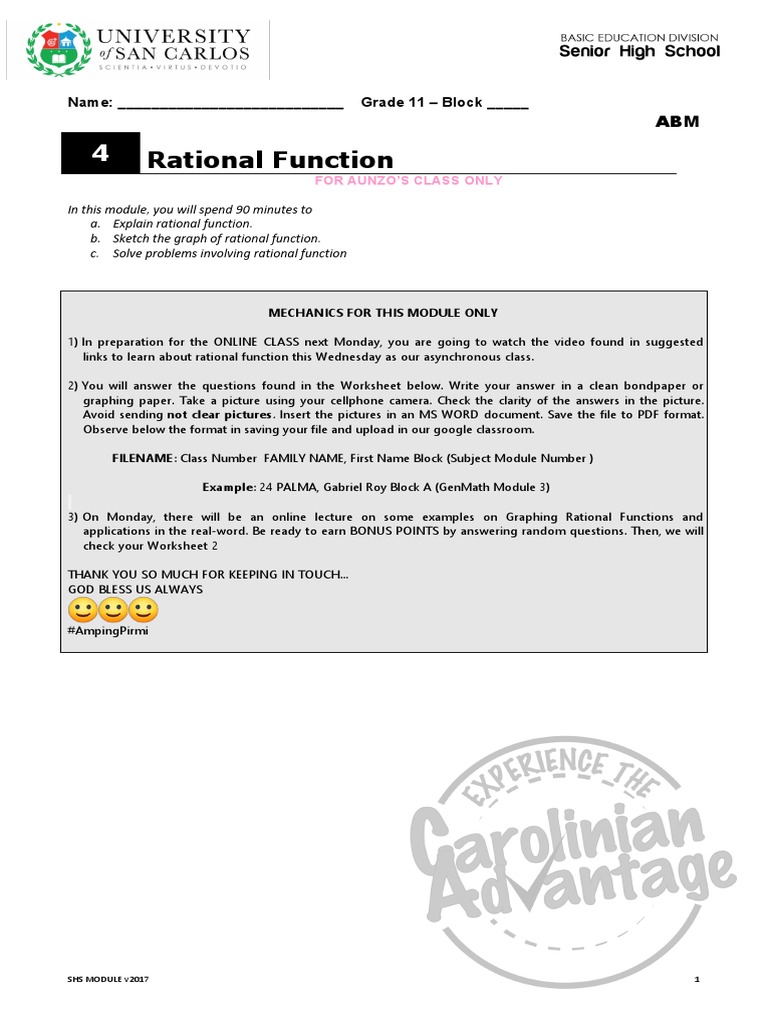 Rational Functions In this chapter, you'll learn what a rational function is, and you'll learn how to sketch the graph of a rational function. Rational functions A rational function is a fraction of polynomials. That is, if p(x)andq(x) are polynomials, then p(x) q(x) is a rational function. The numerator is p(x)andthedenominator is q(x. Graphing Reciprocal and Rational Functions Flip BookThis flip book was created to be used as a stations activity to provide extra practice with graphing reciprocal and rational functions and identifying the following key characteristics: domain, range, x-intercept, vertical asymptote, horizontal asy Graphing Rational Functions Worksheet 2 x2—9 VA Find the VA and HA of the following: x 2 + 4x—5 x 2 VA HA Graph each equation and fi I in all the blanks. Domain-— VA Holes n one x-int y-in HA ax-3 2x2 +9x—18 ) H Q-€(6) us Continuous/Discontinuous X Don-oin VA none Holes x-int 0 6±3) y-int Continuous/Discontinuous UNIT 1: Algebra II Review - SECTION 7 WORKSHEET #1 Date: _____ GRAPHING RATIONAL FUNCTIONS To Identify Types of Discontinuity: Step 1: HOLES (Removable Discontinuities) Factor numerator & denominator Simplify If anything cancels, then there is a hole (More than one factor cancels More than one hole)