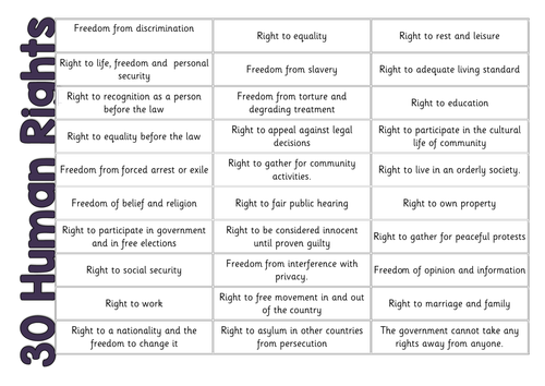 Age range: 14-16. A grid with a one sentence version of each of the thirty articles of the Universal Declaration of Human Rights (UDHR). Some of them have been shortened or re-worded by me, some meaning has inevitably been lost in the simplification but the main aim was to make them easier to understand. The grid can be useful in a whole range.