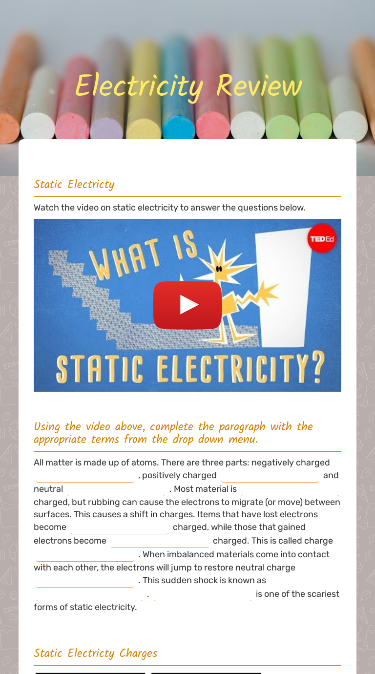 Electricity review worksheet answers. A battery b 2. Here is our collection of printable science worksheets for teaching students about static and current electricity. Electrical Current 1 Natural Science Worksheet Grade 6 Science Worksheets Science Electricity Teaching Science Which material is a conductor. Electricity worksheets with answers. Print electricity worksheets click the buttons to print each worksheet and associated […] where Q 1 and Q 2 represent the charges on the two objects, d represents the separation distance between the object's centers and k = 9x10 9 N/m 2 /C 2. This equation can be rearranged to solve for any quantity in the equation. The substitutions and algebra are shown below. a. F elect = (9x10 9 N/m 2 /C 2)•(1.6 x 10-13 C)•(1.6 x 10-13 C)/(0. Q = It Q = 0.25 x (1 x 60 x 60)s = 900 C. 5. A current of 20 mA flows in a circuit. How much charge passes through a point in the circuit in 1 min 30 sec. Q = It Q = (20 ÷ 1000) x ( 60 + 30)s = 1.8 C. 6. A charge of 60 coulombs passes a point a circuit in 10 secs. Calculate the current flowing. 6A. 7. A charge of 14 coulombs passes a point a. ENERGY RESOURCES STUDENT WORKSHEETS Susana AmorĂ³s Ortega 4 IES TORRE VICENS Lleida The electricity journey: from power stations to our homes 4. Look at the picture. Electricity is produced in power stations and it travels a long way before arriving at our homes.