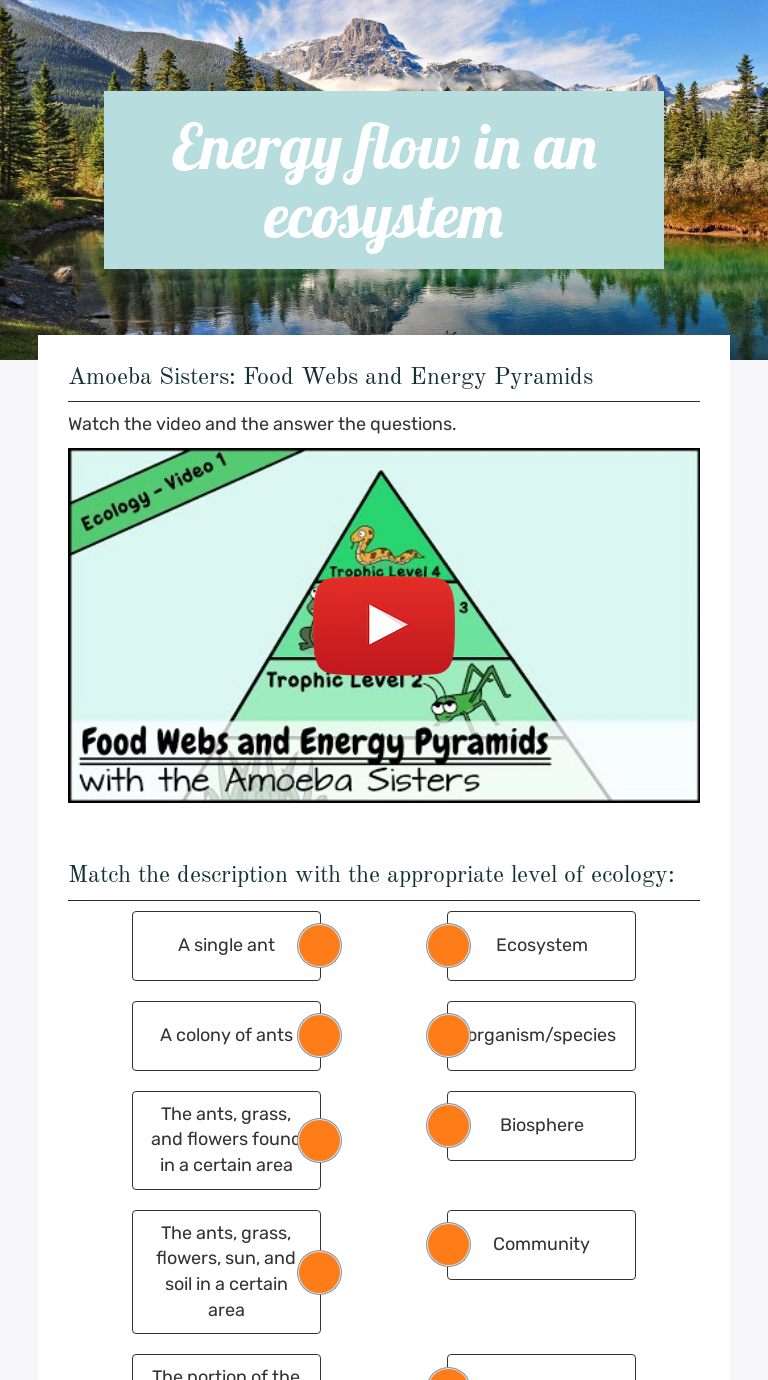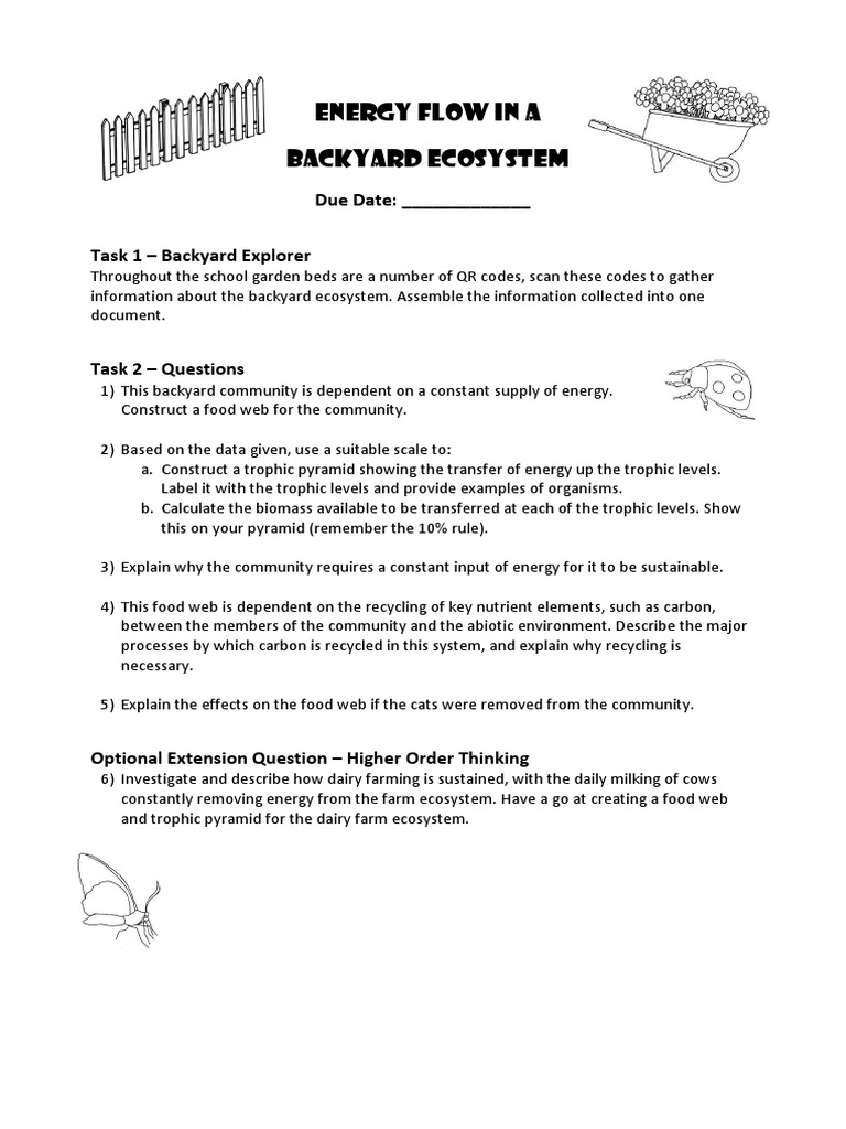 View energy flow in ecosystems worksheet 1 pdf from science biology at yorktown high school. Quiz Energy And Matter Transfer In Ecosystems Ecosystems Energy Science Lessons Energy Pyramid. Beautiful Energy in ecosystems worksheet. Each organism feeds on the one before it. Ecology Worksheets: Energy Flow in Ecosystems is a set of two worksheets that make a great homework assignment (or can be easily used as an class assignment). Designed to reinforce basic topics in energy flow among ecosystems. Included in this bundle are: 1) Food Web "Visual Vibes"- students analy. Subjects: Dec 11, 2012 · A food web consists of all the food chains in a single ecosystem.Each living thing in an ecosystem is part of multiple food chains. Each food chain is one possible path that energy and nutrients may take as they move through the ecosystem. Not all energy is transferred from one trophic level to another. Energy is used by organisms at each trophic level, meaning that only part of the energy.