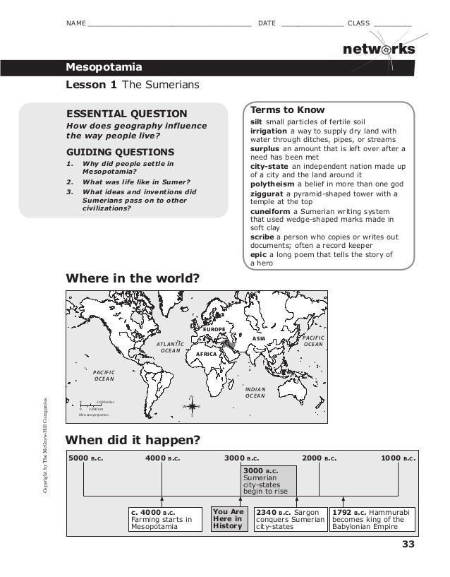 Civilization begins in mesopotamia worksheet answers. ivilization in Ancient Mesopotamia > Gathering the Facts 1. Turn to pages 10—11 of the Atlas. Read the introduction. Also look at chart B, "Sumerians Develop Writing," and picture A and read its caption to complete the following paragraph. The earliest known civilization was called with places as far as It developed in an area organized government—and eventually of civilization. Sumerians Create City-States The Sumerians stand out in history as one of the first groups of people to form a civilization. As you learned in Chapter 1, five key characteristics set Sumer apart from earlier human societies: (1) advanced cities, (2) specialized workers, (3) com- Mesopotamia is a name for the area of the Tigris-Euphrates river system, corresponding to modern-day Iraq, Kuwait, the northeastern section of Syria, and to a much lesser extent southeastern Turkey and smaller parts of southwestern Iran.. See the fact file below for more information on the Ancient Mesopotamia or alternatively, you can download our 19-page Ancient Mesopotamia worksheet pack. Mesopotamia c. 1792 B.C. Hammurabi rules Mesopotamia 3000 3000 BB..CC. 2250. 2250 BB..CC. 1500 . 1500 BB..CC.. Uruk Babylon 132 CHAPTER 1 • The First Civilizations History Social Science Standards WH6.2 Students analyze the geographic, political, economic, religious, and social structures of the early civilizations of Meso-potamia, Egypt.