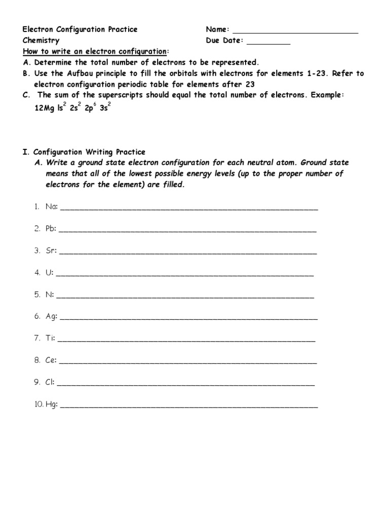 Electron configuration worksheet this worksheet provides extra practice for writing electron configurations. Electron configuration of elements element configuration answer key element c n o f ar al p. Linked to electron configuration worksheet 2 answer key what is your greatest weakness. A neutral atom containing ten negative charges is the.