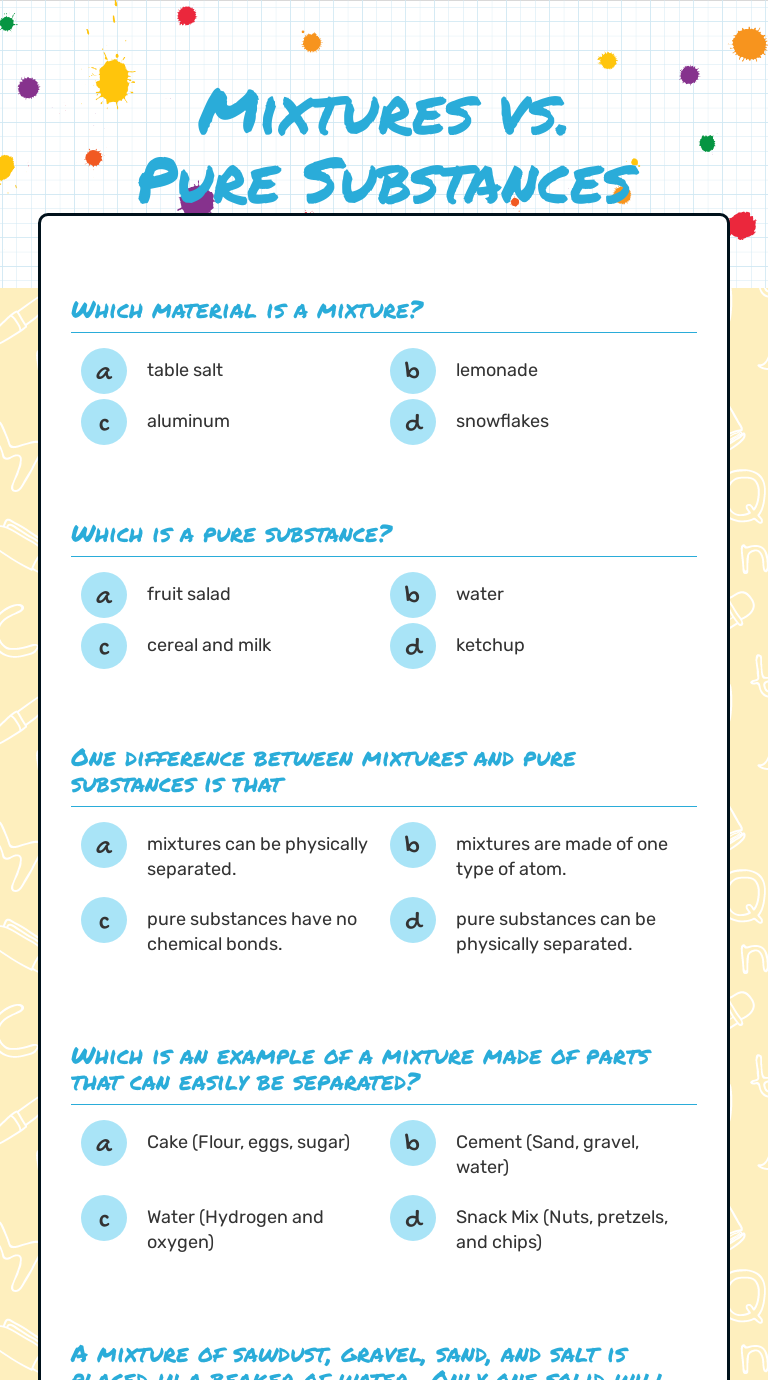Pure Substances and Mixtures Homework For questions 1-12, fill in the table. First, identify the piece of matter as a pure substance or a mixture. Second, identify the piece of matter as an element, compound, homogeneous mixture, or heterogeneous mixture. Matter Mixture or Pure Substance Element, Compound, Homogeneous, Heterogeneous Helium Gas 1. Start studying Substances vs. Mixtures Worksheet. Learn vocabulary, terms, and more with flashcards, games, and other study tools. 2. Guide students to sort cards into pure substances and mixtures (but do not use the words pure substances or mixtures). Students create a "rule" for these groupings. Do this on notecards, or scrap paper. 3. Pass out the labels "Pure Substances" and "Mixtures" and have students place the correct label on
