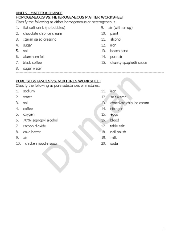 Some of the worksheets below are Pure Substances And Mixtures Worksheets, learn how to differentiate between a pure substance, homogeneous mixture and a heterogeneous mixture, identify properties of a pure substance, exploring the methods useful for the separation of mixtures including Distillation, extraction, filtration, decanting, centrifuging, sublimation.