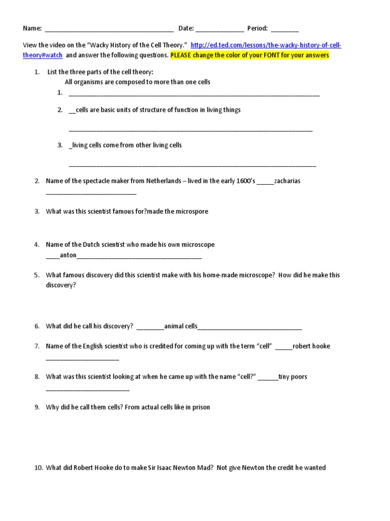 Cell theory worksheet answer key