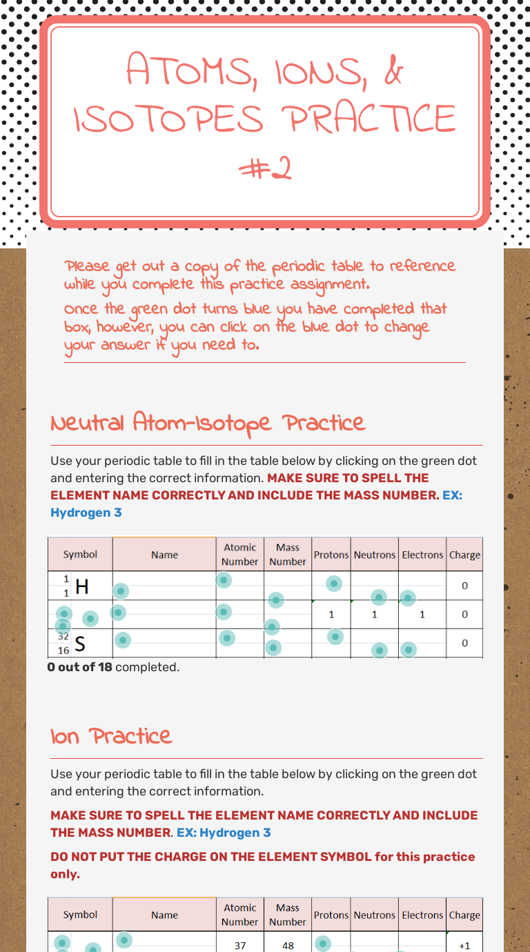 Atoms isotopes and ions atoms the number of protons in an atom determines the identity of the atom. Some of the worksheets for this concept are isotopesions work element element atomic mass atoms and isotopes work atom ion isotopes work isotope practice work scanned from a xerox multifunction er examples lithium 7 x 3 li 3 protons 4 neutro s. The Chemistry Basics Series: Atoms, Ions, and Isotopes Practice Sheet allows students to explore atomic structure through a comparison of neutral atoms, ions, and isotopes. Two options are included. Download a digital copy through Google DriveTM or a "print & practice" sheet. This practice gives