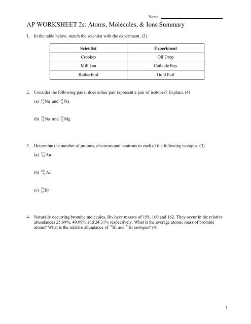 Worksheet atoms isotopes and ions
