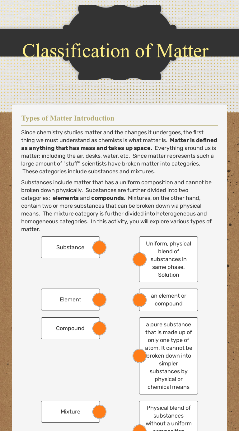 Chemistry Worksheet on Classification of Matter. For each classification, provide those characteristics that distinguish it from the others. Be complete, thorough, detailed, yet concise in your responses. Heterogeneous mixture – Solution – Compound – Element – Classify each of the following pieces of matter as: element, compound.