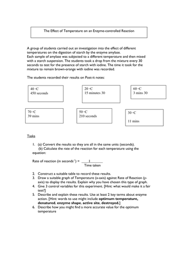 Enzyme reactions worksheet answers. Virtual Lab Enzyme Controlled Reactions Worksheet Answers as Well as Enzyme Worksheet. Download by size: Handphone Tablet Desktop (Original Size) In this type of chemistry course, you are studying real life molecular biology and the process of protein synthesis. The equation has a formula that is a guide for figuring out reactions that happen. 22. Sketch a graph that shows the relationship between the rate ofan enzyme reaction and the concentration of coenzyme necessary for the enzyme to function properly. 23. Add a line to graph C of Model 2 that shows the rate of an enzyme reaction in the presence of inhibitor molecules. Enzymes and Cellular Regulation Answers will vary but may include: The enzyme may be used over and over again reducing the amount of resources the cell would have to use to make more enzyme. The enzyme is not a direct reactant in the cellular chemical reaction and doesn't change in order to avoid interference with cellular reactions. enzyme active site Products Teacher Key. Stephen Yap on Ph And Enzyme Activity Worksheet Answer Key. 2346e397ee Enzymes are the biological substance (proteins) that act as CATALYSTS and help complex reactions. A door that is locked needs a key that is just the right shape to fit in that lock.... Using graph 3, explain how pH affects enzyme activity..