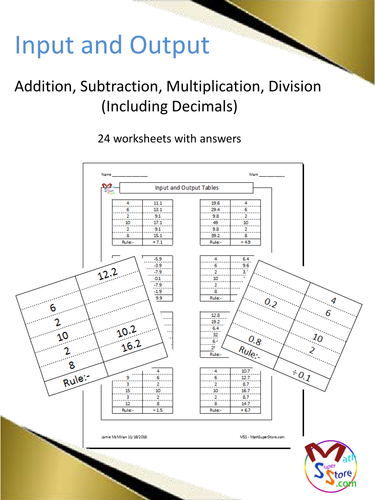 Printable worksheets with in and out tables (sometimes known as in-out boxes or input output tables). Worksheets cover basic operations, decimals & measurement.