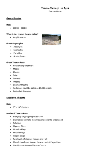 Theatre Through the Ages. This is a starter activity for year 9 students who are about to begin a look into Greek Theatre, Medieval Theatre, Shakespeare and Commedia dell' Arte in their drama lessons. I have designed it as a whole class activity and there are plenty of blanks for a class to be filling in. The teacher notes is simply the answers ...