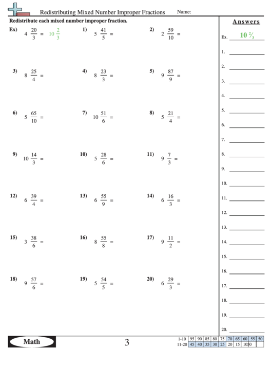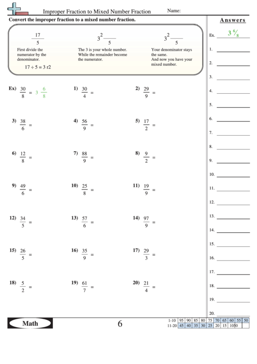Convert the improper fraction to a mixed number fraction. Improper Fraction to Mixed Number Fraction. Math www.CommonCoreSheets.com. Name: Answers.2 pages