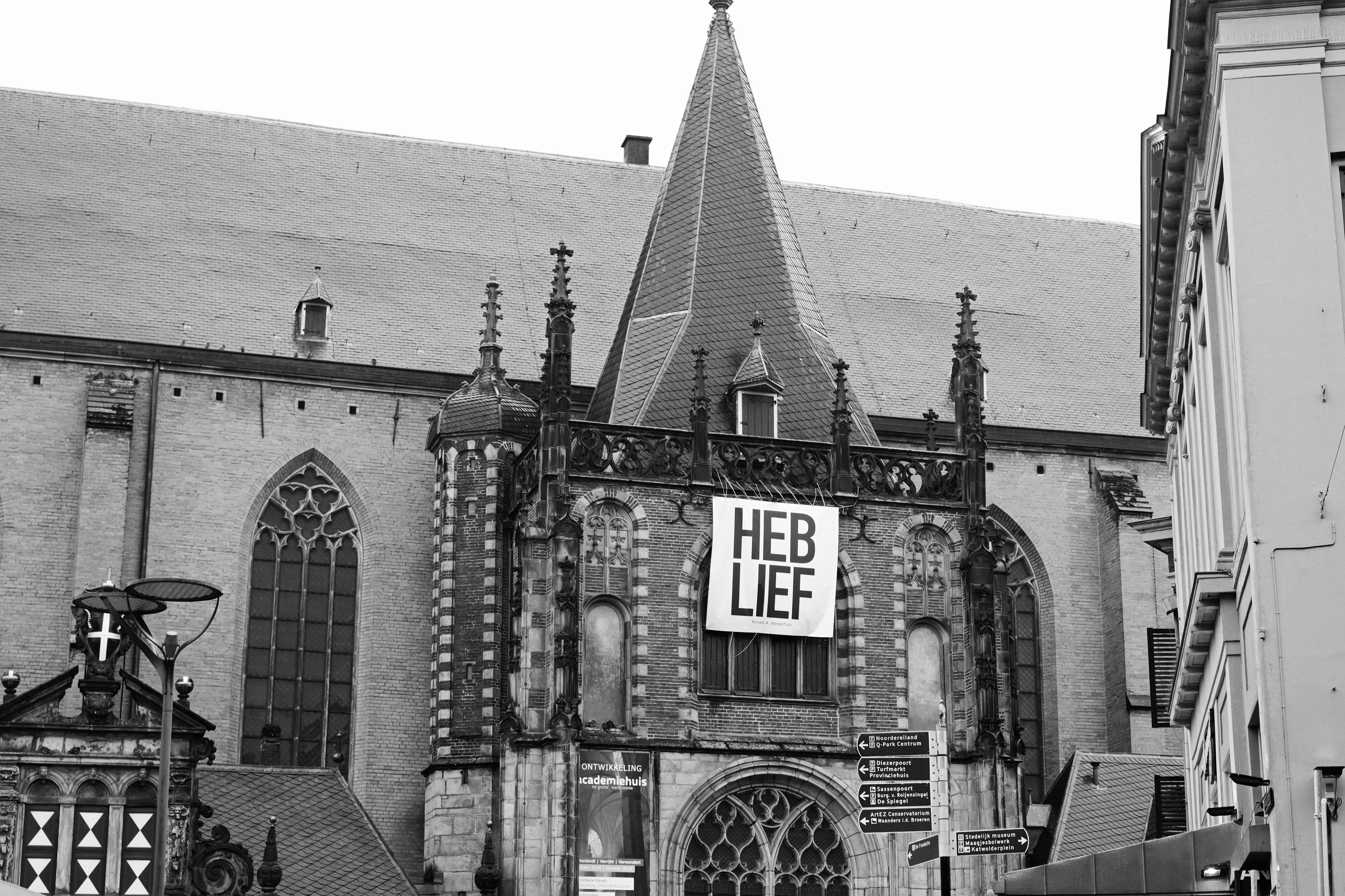 Grote kerk (the Big Church) with a banner that says 'love [each other]' in Zwolle, the Netherlands.