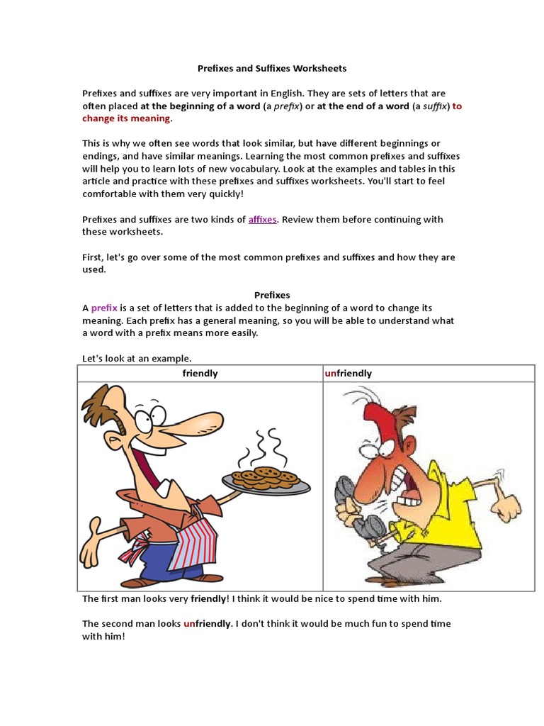 Prefix and suffix worksheet. This handy suffixes activity worksheet comes in a helpful table format.It includes the suffix, what the suffix means, and examples of how to use the suffix. Pupils are then prompted to provide a few examples of any words they can think of that end with the suffix.Check out our matching prefixes worksheet here, or for specialist ing cards, try ... Prefixes and suffixes worksheets and online exercises. Language: English Subject: English as a Second Language (ESL) Order results: Most popular first Newest first. Prefixes and suffixes. Grade/level: pre - intermediate. by natippers. Prefixes and suffixes. Grade/level: preintermediate. Prefix and Suffix worksheet. Suffixes are word endings we add to change how we use the word. Print these prefix and suffix worksheets to enhance the vocabulary skills of students. In these worksheets students are asked write prefix and suffix words and what they mean. In grade 4 students start to learn the most used of these root words and affixes. Prefix And Suffix Pdf Download Pdf; Prefix And Suffix List Pdf; Suffixes-ful ©www.thecurriculumcorner.com-ly-or-able. A prefix is a word added before a root word to make a new word. A person who is. Suffixes Worksheets PDF files are easy to find and download on the internet. They're also very simple to use.